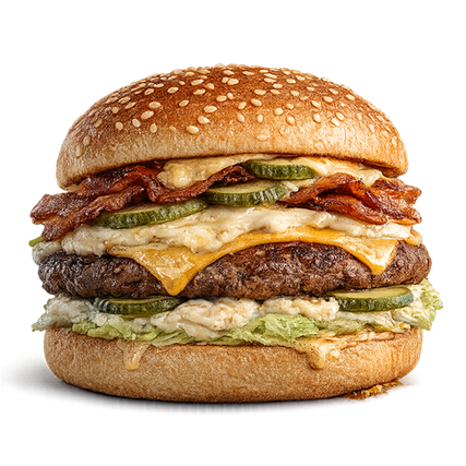 Meso, čedar, hrskava slanina, western sos, iceberg